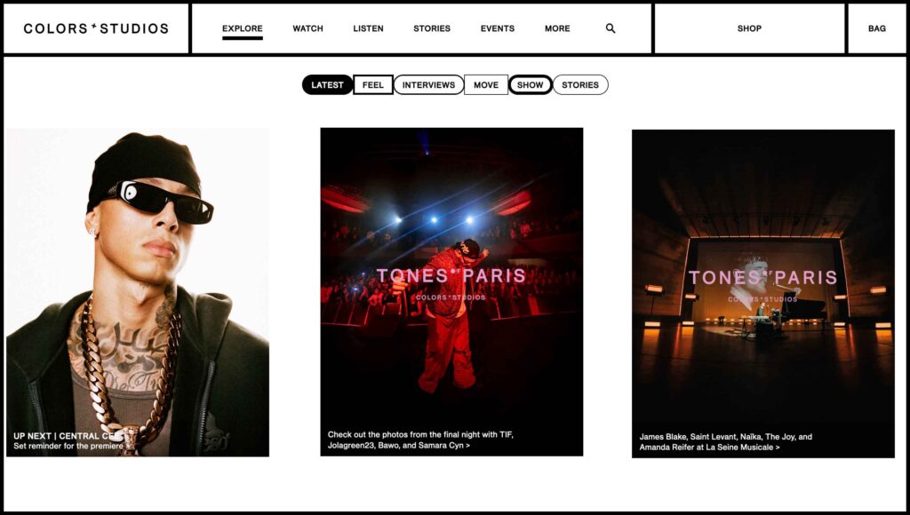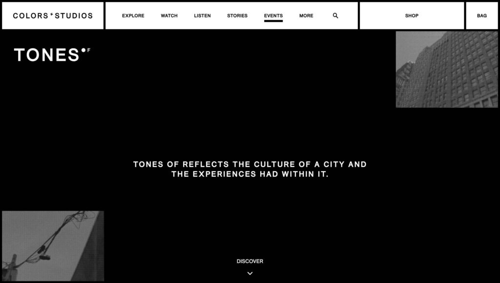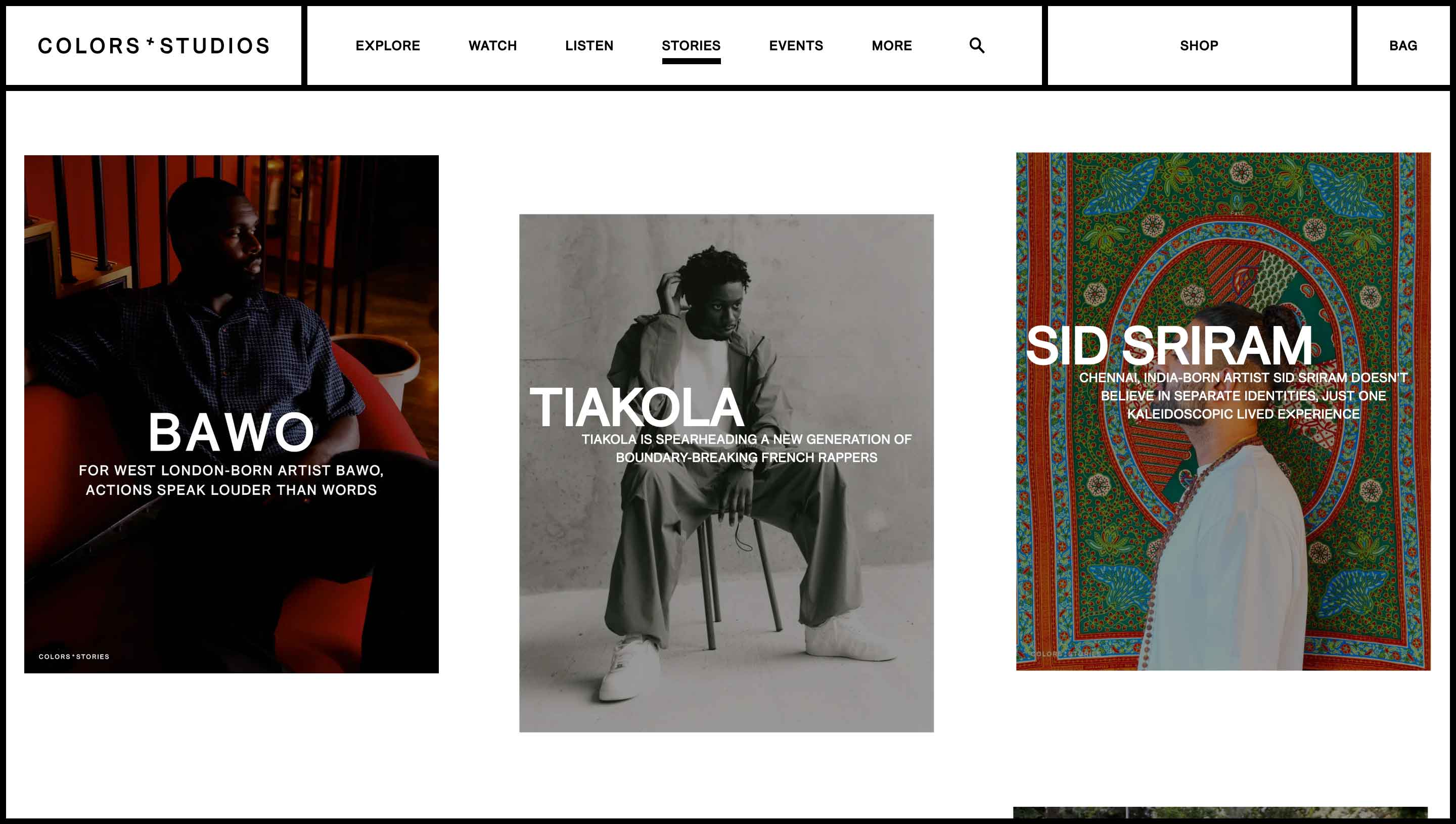 The COLORS x STUDIOS website colour scheme is prodominanty kept to a minimal black and white. This suits their website due to the content that they produce for the website.