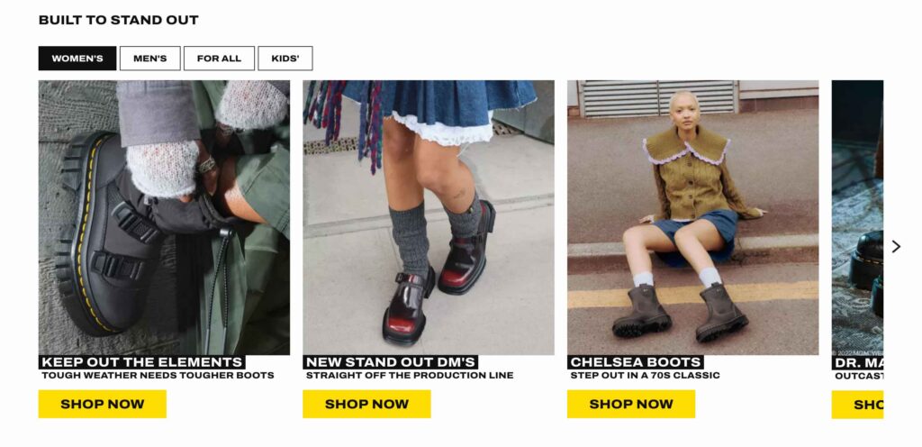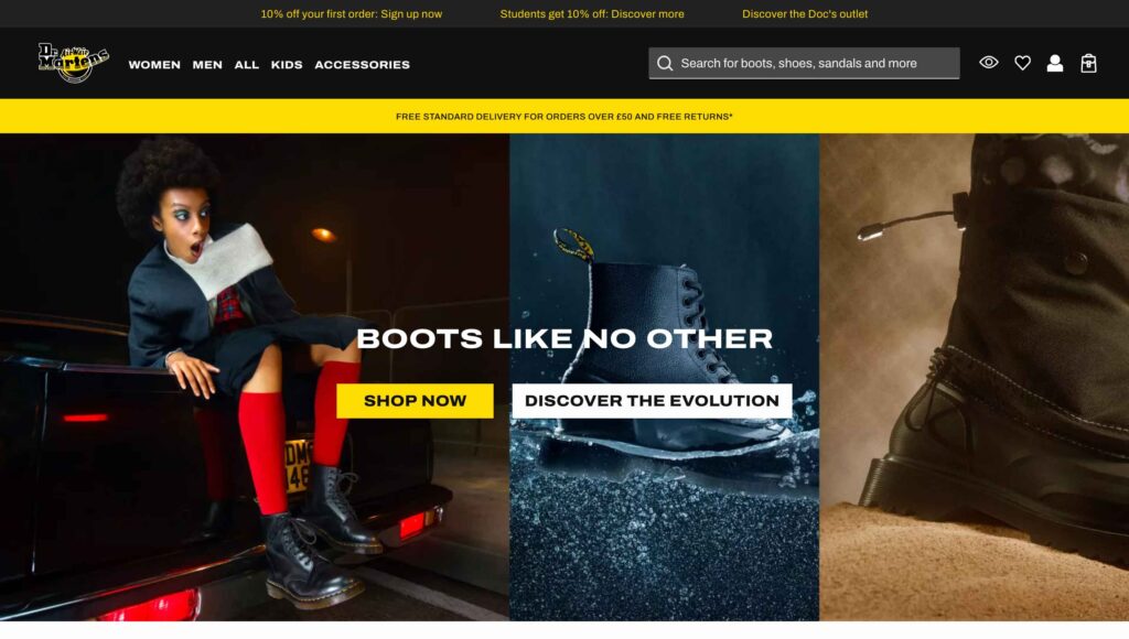 Dr marten have a strong brand image which is reflected in their colour scheme. The core colours are black and yellow which ressembles their original boots which sport their iconic yellow stitching.